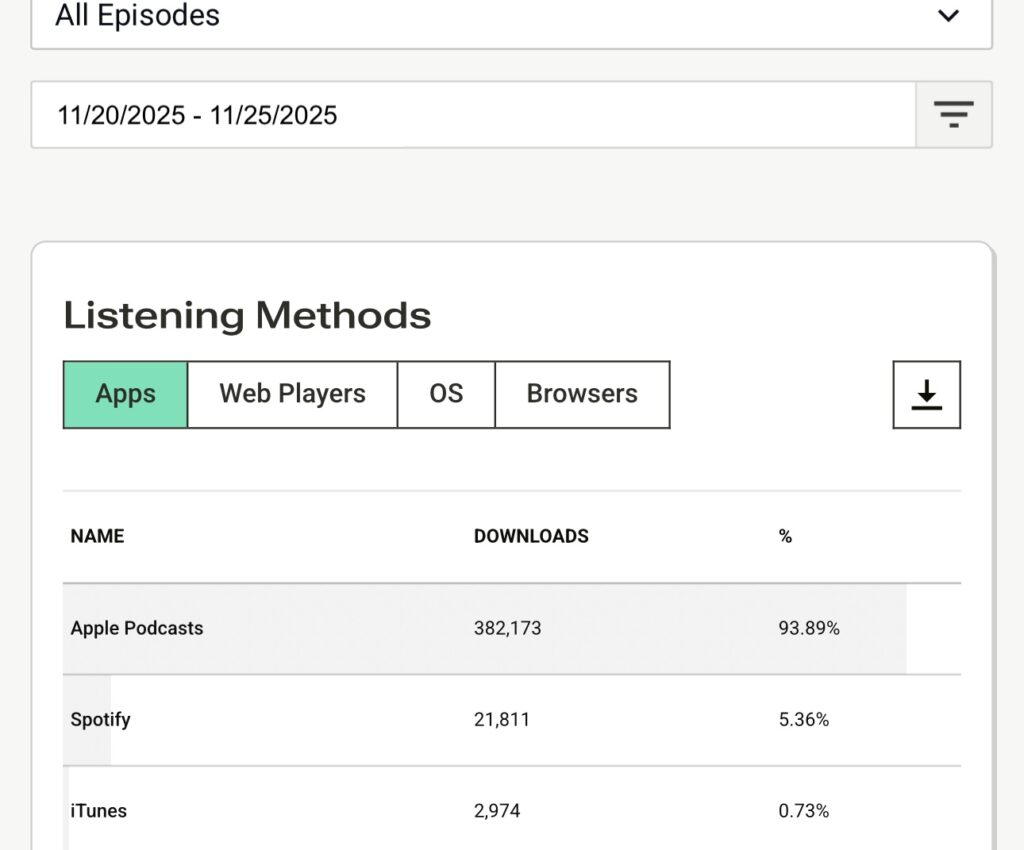 A lifestyle podcast scaled to 500,000+ weekly downloads, with consistent upward momentum every single week.
